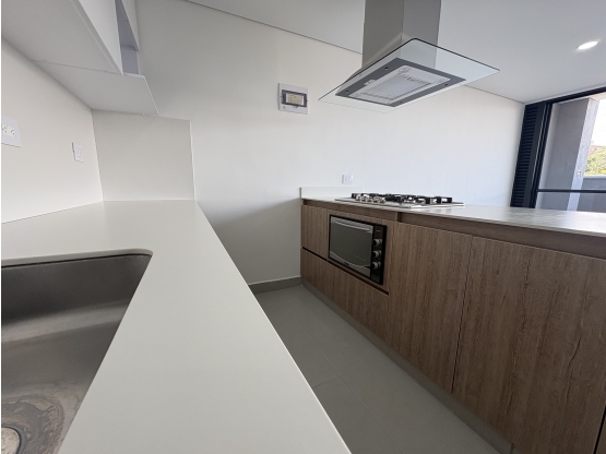 Su generosa distribución interior está diseñada para el máximo confort familiar. Cuenta con tres habitaciones: la principal es una suite completa con baño privado y un amplio vestier, mientras que las dos habitaciones auxiliares están equipadas con su respectivo clóset. La moderna cocina integral con barra auxiliar se integra a una espaciosa sala comedor que conecta con el balcón. Además, dispone de un baño social y una zona de ropas independiente con calentador.